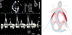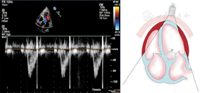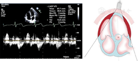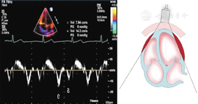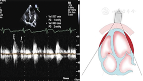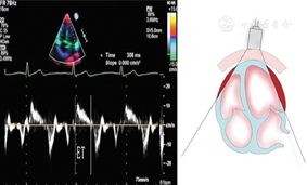 (3)频谱多普勒超声心动图(其中包括脉冲波频谱多普勒和连续波频谱多普勒)是观察和测量心腔内血流动力学参数的主要技术方法。主要应用于在彩色多普勒血流图引导下采集主动脉口、肺动脉口、二尖瓣口、三尖瓣口和右肺上静脉及其他心腔和血管腔内的血流速度频谱。