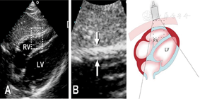 建议在舒张末期胸骨旁左心室长轴切面测量右心室前壁厚度及前后径,在剑下切面三尖瓣腱索水平测量右心室游离壁的厚度。在舒张末期胸骨旁大动脉短轴切面距肺动脉瓣环约2 cm处测量收缩期右心室流出道内径。