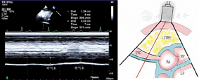 胸骨旁左心室长轴切面,显示舒张末期主动脉瓣环内径、主动脉窦部内径和主动脉根部内径以及收缩末期左心房前后径测量方法,建议在窦管线上2 cm处测量主动脉根部内径,窦部内径测量应当避开右冠状动脉开口的漏斗部。左心室流出道前后径应在主动脉瓣下1 cm处测量。左心房测量应避开膨大的无冠窦窦壁和肺静脉开口