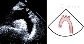 探头置于胸骨左缘第3、4肋间,扫查声束平面与右胸锁关节和左乳头的连线平行。