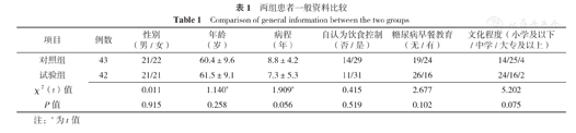 共纳入90例患者,其中对照组2例患者分别因脑梗死复发、嫌控制饮食麻烦退出研究,试验组3例患者分别因搬迁、外出打工、拒绝随访退出研究;失访率为5.6%。两组患者性别、年龄、病程、自认为饮食控制、糖尿病早餐教育、文化程度比较,差异无统计学意义(P>0.05,见表1)。