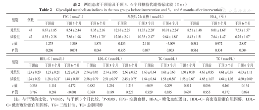 两组患者干预前FPG、早餐后2 h血糖、HbA1c、HDL-C、LDL-C、TG、TC比较,差异无统计学意义(P>0.05);干预3个月两组患者FPG、HbA1c、HDL-C、LDL-C、TG、TC比较,差异无统计学意义(P>0.05);干预3个月试验组患者早餐后2 h血糖低于对照组,差异有统计学意义(P<0.05);干预6个月两组患者FPG、LDL-C、TG、TC比较,差异无统计学意义(P>0.05)。