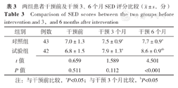 干预前、干预3个月两组患者SED评分比较,差异无统计学意义(P>0.05);干预6个月试验组患者SED评分高于对照组,差异有统计学意义(P<0.05)。