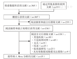 初步检索得到相关文献365篇,采用EndNote X9软件去除重复发表的文献,经仔细阅读题目、摘要及全文后,最终纳入文献15篇[5,6,7,8,9,10,11,12,13,14,15,16,17,18,19],均为中文文献,共计1 476例患者。文献筛选流程见图1。