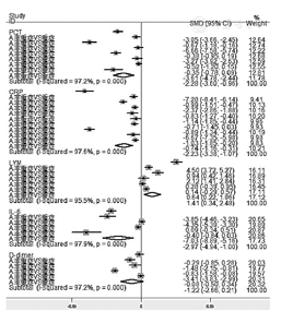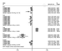 作为呼吸道新型传染疾病,SARS-CoV-2首先会攻击肺脏,传染性极强,传播速度很快,已纳入《中华人民共和国传染病防治法》并按甲类传染病管理的乙类传染病进行管理[4]。目前临床对其病情轻重判断、预后情况等很多相关问题仍在不断认识完善中,通过运用Meta分析的方法探寻COVID-19患者病情严重程度和预后指标(CRP、PCT、IL-6、D-dimer、LYM)之间的关系,可以为临床发现潜在重症病例以及评估患者预后提供循证证据,为相关治疗规程及操作指南的形成提供参考。