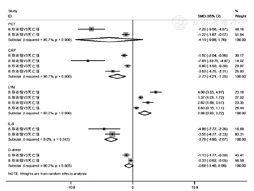 (1)纳入文献样本量较小;(2)纳入患者病情严重程度不同结合年龄差异较大导致研究之间的降钙素原(PCT)和白介素-6(IL-6)的值差异较大,置信区间重叠较小,因而异质性较大;(3)纳入的研究大多缺乏分配隐藏和双盲的实施,可能存在选择偏倚。故此结论尚需更多高质量、多中心、大样本的随机对照试验进一步证实。
