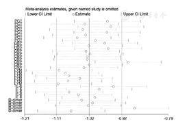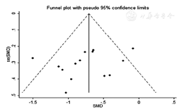 以CRP、D-dimer为指标进行发表偏倚分析,采用Egger's检验进行发表偏倚分析,以每一个独立研究SMD对数的标准误为横坐标,每一个独立研究SMD的对数为纵坐标,绘制漏斗图,详见图7。结果显示Egger's检验P为0.237,提示存在发表偏倚的可能性较小。
