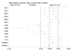 由于本文纳入的COVID-19患者病情严重程度不同,患者年龄差距也较大,因此不同年龄段患者的预后指标数值差距较大,这可能是异质性的主要来源。对于A组来说,每项研究的异质性均较大,因此每次将一项纳入研究剔除后,将剩余研究进行合并,分析单项研究对合并结果的影响,发现逐一剔除敏感性分析中置信区间重叠率较小的文献后,异质性明显下降(I2=50.3%,0,0,0,45.9%)。在B组的纳入文献中,PCT、IL-6,D-dimer均只有两项研究,因此无法进行敏感性分析降低异质性,而CRP和LYM无论剔除哪一篇文献,异质性均较大。敏感性分析结果详见图4,图5。A组PCT、CRP、LYM、IL-6、D-dimer这五个指标进行敏感性分析后,逐一排除导致异质性较大的文献,重新进行Meta分析获得了异质性符合要求的结果,PCT:I2=50.3%,〔SMD=-0.56,95%CI (-1.05,-0.07),P=0.003〕;CRP:I2=0,〔SMD=-0.72,95%CI (-0.93,-0.51),P<0.001〕;LYM:I2=0,〔SMD=2.48,95%CI (1.84,3.11),P<0.001〕;IL-6:I2=0,〔SMD=-5.06,95%CI (-6.37,-3.76),P<0.001〕;D-dimer:I2=45.9%,〔SMD=-0.57,95%CI (-1.09,-0.06),P=0.003)〕(见图6)。