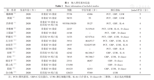 | 昌仲勇[7] | 2020 | 非重症VS重症&存活组VS死亡组 | 93/35&130/20 | 55.27 | PCT、CRP、IL-6 | 4 |