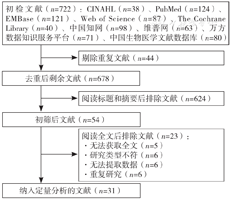 初检共获得相关文献722篇,经去重、初筛和全文筛选最终纳入31篇文献[8,9,13,14,15,16,17,18,19,20,21,22,23,24,25,26,27,28,29,30,31,32,33,34,35,36,37,38,39,40,41]进行Meta分析,BCRL患者2 618例。文献筛选流程及结果见图1。