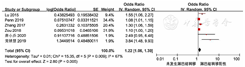 6篇文献[17,29,34,38,39,41]报道了淋巴结转移阳性情况对BCRL的影响。异质性检验结果显示,I2=67%,P=0.009,经敏感性分析,异质性未见明显改变,采用随机效应模型进行Meta分析,结果显示,淋巴结转移阳性是BCRL的影响因素〔OR=1.22,95%CI(1.06,1.39),P=0.005〕,见图9。