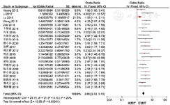 采用RevMan 5.3软件进行数据统计分析。统计结果采用比值比(OR)及95%可信区间(CI)表示。Meta分析采用倒方差法对OR值进行合并。采用χ2检验进行分析(检验水准为α=0.1),并结合I2判断纳入研究的异质性,若I2<50%且P>0.10,采用固定效应模型进行Meta分析;反之,则采用随机效应模型进行Meta分析,并进一步亚组分析或敏感性分析探讨异质性来源。当单个危险因素分析纳入文献数≥10篇,采用RevMan 5.3软件绘制漏斗图,并结合Begg's检验进行发表偏倚评价。以P<0.05为差异有统计学意义。