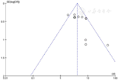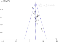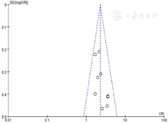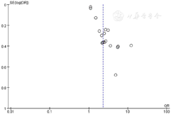本研究通过采用Revman 5.3软件绘制漏斗图,并结合Begg's检验对纳入文献≥10篇的单个危险因素进行发表偏倚评价。结果显示,体质指数(P=0.234)、腋窝淋巴结清扫范围(P=0.210)无明显的发表偏倚,见图12,图13;放疗(P=0.039)、术后愈合并发症(P=0.012)存在一定的发表偏倚,见图14,图15。