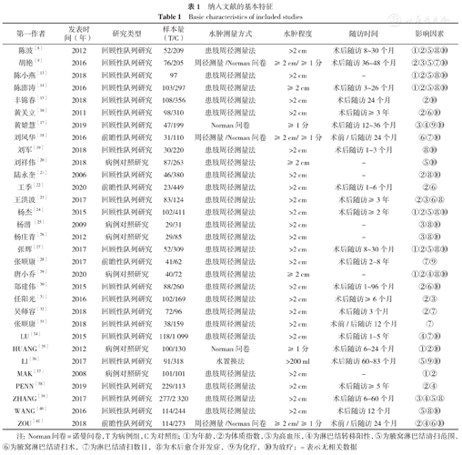 | 第一作者 | 发表时间(年) | 研究类型 | 样本量(T/C) | 水肿测量方式 | 水肿程度 | 随访时间 | 影响因素 |