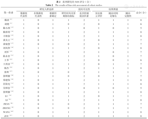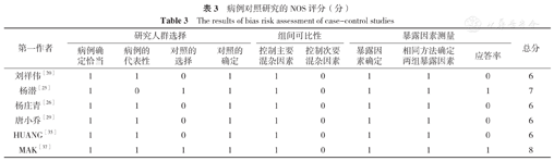 由两名研究者独立评价纳入文献的偏倚风险,如有分歧则通过双方讨论或与第三方协商解决。病例对照研究和队列研究的偏倚风险评价采用纽卡斯尔-渥太华量表(New Castle-Ottawa Scale,NOS),NOS由3个维度8个条目组成,满分为9分。评价内容包括研究人群选择4个条目(4分)、组间可比性1个条目(2分)、结果/暴露因素测量3个条目(3分),评分为5~9分属于高质量研究[12],得分越高表示偏倚风险越低。