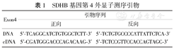 经家属和患者同意,获取患者肿瘤组织和外周血行基因检测。第一步肿瘤组织DNA提取与测序:使用Omega Tissue DNA Kit(Omega BiotekD3396-02)提取组织DNA,然后进行PCR扩增,由上海韦翰斯生物医药科技有限公司靶向富集内分泌代谢遗传病相关的1 500个基因的外显子及毗邻剪接区域,并进行高通量测序;第二步Sanger测序在肿瘤组织和外周血进行验证:采用天根血液基因组DNA提取试剂盒(TIANamp Blood DNA Kit, #DP348-03)提取患者外周血DNA,参考SDHB基因序列(OMIM-003000),运用Primer3Plus软件设计第4外显子引物序列(表1),并通过NCBI Primer-BLAST进行验证引物特异性,然后进行PCR扩增,PCR产物纯化后在ABI3730基因测序仪上对产物进行单向测序;第三步通过RT-PCR方法对肿瘤组织目的mRNA片段进行反转录、扩增及测序:使用试剂TRlzolOR Reagent(Ambion,15596026)提取患者组织样本及对照组织样本mRNA,使用试剂盒HifairTM II 1st Strand cDNA Synthesis Kit(gDNA digester plus)(Yeason Biotech,11121ES50)将mRNA反转录为cDNA,设计引物(表1),然后进行PCR扩增和测序。