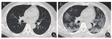 病变发生于两肺各部位,28例患者胸部CT检查主要表现为磨玻璃影21例(75.0%),边缘模糊18例(64.3%),斑点、斑片影17例(60.7%),部分肺纹理增粗、紊乱7例(25.0%),可见条索影7例(25.0%),局部支气管扩张2例(7.1%),淋巴结增多、增粗、血管影、结节影与无壁透亮区各1例(3.6%)。见图1。1例重型肺炎患者入院时两肺纹理增多,两肺内见多发斑片状磨玻璃影,边缘模糊,6 d后肺部病变短期内进展迅速,表现为两肺弥散病灶,磨玻璃影范围增大,双侧胸膜增厚,见图2。