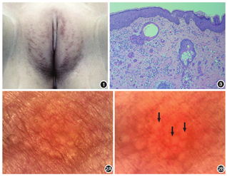患儿女,6岁,因外阴皮色丘疹1个月就诊于四川大学华西医院皮肤性病科。1个月前,患儿家长发现患儿两侧大阴唇数个粟粒大小的皮色丘疹,无自觉症状,未予诊治。之后皮疹逐渐增多、增大,部分融合成片。患儿体健,家族中无类似病史。一般情况可,系统检查未见异常。皮肤科检查:两侧大阴唇散在分布针头至粟粒大的皮色扁平丘疹,较大者呈半球形,部分密集分布至融合,边界清楚,表面光滑、干燥,质韧,无压痛,挤压无油性物溢出(图1)。初步考虑皮脂腺增生?外阴汗管瘤?皮肤镜检查:非偏振光下见数个突出于皮面高低不平的丘疹,皮纹分布不均匀(图2A);偏振光下见淡红色背景下铺路石样排列黄白色类圆形结构,周围穿插线状血管,部分细小血管穿过圆形结构(图2B)。皮损组织病理:表皮大致正常,真皮浅层及中层见中等量淋巴细胞浸润,真皮浅中层较多类圆形细胞,多排列成巢状,部分呈大小不等的细胞条索,可见特征性蝌蚪状结构(图3)。