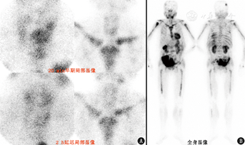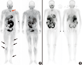 再来看骨骼异常摄取的问题。99Tcm-MIBI是一种亲脂性正价阳离子化合物,可通过被动转运或质膜电势差进入细胞线粒体内,而线粒体是细胞完成三羧酸循环及氧化磷酸化的场所,为细胞代谢提供ATP,因此细胞代谢越活跃,就需要越多的线粒体供能,摄取99Tcm-MIBI就越多。99Tcm-MIBI曾用作肿瘤显像剂,一些非肿瘤性的代谢活跃病变也可摄取99Tcm-MIBI。对于存在甲状旁腺功能亢进症的患者,纤维囊性骨炎(棕色瘤)可导致99Tcm-MIBI显像中出现骨异常摄取,呈囊状膨胀性溶骨性破坏,通常累及中轴骨、股骨和颌骨[1,2],在99Tcm-MIBI图像上表现为骨骼单发或多发的局灶性摄取增高灶(图2),临床要注意对多发的棕色瘤与转移瘤进行鉴别。另一个与甲状旁腺功能亢进症相关的骨骼摄取原因是肾性骨病,在肾衰竭导致的继发或三发性甲状旁腺功能亢进症中,肾性骨病可导致骨骼系统摄取99Tcm-MIBI[3,4](图3)。但无论是棕色瘤还是肾性骨病,其影像表现都与本例有显著不同:棕色瘤是单发或多发局灶性的骨病灶,本例主要是弥漫性病变;肾性骨病是骨质摄取99Tcm-MIBI增加(图3中四肢长骨摄取的形态是骨骼本身的摄取),而本例骨骼异常摄取是骨髓摄取,骨皮质未见明显受累(可比较图1与图3中四肢长骨显影形态、宽度的区别)。因此,从临床和图像特点上均可以排除甲状旁腺功能亢进症相关的骨骼异常表现。