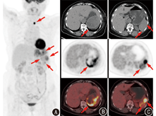 目前并未发现可用于术前诊断脾MFH的特征性影像学表现。Makis等[2]报道了1例脾MFH肝转移的PET/CT显像,发现肝脾多发薄壁囊实性占位,坏死明显,边缘FDG代谢异常增高,脾脏最大病灶约9.6 cm×7.5 cm,SUVmax15.8。本例患者发现相对较早,未见远处转移,PET/CT显像与上述报道有不同之处,除了部分病灶见明显坏死,还有多处呈实性肿块,FDG代谢亦略低,因此,脾MFH影像学特点还需进一步总结。本例病灶光学显微镜下核分裂象多见,且免疫组织化学示细胞增殖核抗原Ki-67阳性指数约30%,提示肿瘤细胞增殖活跃,恶性程度高,与18F-FDG显像高摄取相符,而肿瘤的快速生长及炎性反应细胞的浸润可能是部分病灶出现囊变坏死的原因,从而在18F-FDG显像时呈现出缺损区。虽然本例18F-FDG显像无法做出确切的术前诊断,但可提示病变为脾脏原发恶性肿瘤,且无局部及远处转移,为临床准确分期、制定治疗方案提供了依据。