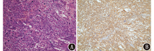 MFH是一种主要发生于软组织的肉瘤,没有特定的已知分化线,脾原发性MFH罕见,其临床特点和生物学特性尚未明确,在所有原发性脾脏肿瘤中的发病率也难以评估。首例脾MFH由Govoni等[1]在1982年报道,目前文献报道少于20例[2]。脾MFH好发年龄为40~60岁,男性发病略高于女性,临床症状不典型,约70%患者有腹痛、脾肿大、体质量减轻、发热等体征,据报道有2例发生自发性破裂[2,3,4]。本例甲状腺左叶病灶从超声及PET/CT影像表现来看更倾向甲状腺原发肿瘤,且患者腹腔未发现转移灶,甲状腺孤立转移可能性较小。脾MFH根据组织病理学分型可分为5类,包括多形性、黏液性、炎性、巨细胞性和血管瘤样性,其中多形性和炎性多见,各类之间预后无明显差异。MFH常与一些肉瘤混淆,如纤维肉瘤、平滑肌肉瘤、脂肪肉瘤和横纹肌肉瘤,免疫组织化学是鉴别的关键,原发性脾MFH的vimentin、CD68和α1-抗胰糜蛋白酶(α1-anti-chymotrypsin, α1-ACT)呈阳性表达,而CD31和CD34呈阴性表达。