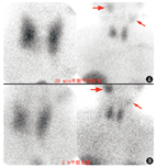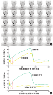 由于多种原因可能导致99Tcm-MIBI甲状旁腺显像假阴性或摄取不典型,如果能够证实右侧颌下区结节是存在变异的颌下腺,则左侧胸锁乳突肌内侧结节就可明确诊断为不典型的甲状旁腺腺瘤或增生,因此本例患者行99TcmO4-唾液腺显像(图4)以资鉴别。唾液腺显像见双侧腮腺摄取正常,右侧颌下结节摄取增高,左侧仍未见颌下腺显影。由于甲状旁腺及其来源的病变不具备摄取99TcmO4-的功能,且患者口服维生素C后腮腺和右侧颌下结节的放射性摄取-时间曲线变化一致,因此考虑右侧颌下结节仍为颌下腺来源,左侧颌下腺萎缩或缺如,而左侧胸锁乳突肌内侧结节为甲状旁腺腺瘤或增生。