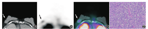 为鉴别该肿块的良恶性,患者于本科行99Tcm-甲氧基异丁基异腈(methoxyisobutylisonitrile, MIBI)SPECT/CT显像,于左侧肘静脉注射99Tcm-MIBI(上海欣科医药有限公司苏州分公司提供,放化纯>95%)111 MBq后,分别于注射后20 min及2 h取俯卧位行胸部SPECT/CT(荷兰Philips公司Precedence)断层采集。早期显像(图1)示双侧乳腺腺体致密,右乳外上象限见一大小3.0 cm×2.8 cm软组织肿块影,与周围乳腺组织分界欠清,密度较均匀,未见钙化,边缘无毛刺;该病灶放射性摄取高于周围正常乳腺组织,肿瘤/正常乳腺组织放射性值(tumor/non-tumor, T/NT)为3.9;2 h延迟显像示该病灶放射性摄取减低,但仍高于周围正常乳腺组织,T/NT为2.6,考虑该病灶为恶性病变的可能性大。