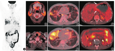 患者之后行胃镜,见胃体黏膜粗糙,多发小结节样隆起及散在浅溃疡,活检病理提示黏膜相关性淋巴瘤。再行经支气管镜肺活检,亦提示黏膜相关性淋巴瘤。临床予利妥昔单克隆抗体+环磷酰胺+表阿霉素+长春地辛+泼尼松(R-CHOP方案)化疗4程后复查PET/CT,肺、胃肠道、胰腺、甲状腺病变基本消失,淋巴结代谢减低,唾液腺肿胀好转、代谢减低。
