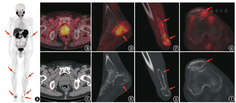 肿瘤骨转移首先发生在红骨髓最丰富的中轴骨,这可能与血运和骨髓微环境有关。少见情况下,肿瘤骨转移也可能只出现于四肢骨骼而中轴骨不受累(图2)。但大部分的肿瘤骨转移以累及中轴骨为主,仅累及四肢远端骨骼且病灶多发的情况少见。前列腺癌骨转移通常为成骨性,以新骨形成为特征,这可能与前列腺癌释放的PSA可裂解甲状旁腺激素相关蛋白有关,其可阻断肿瘤诱导的骨质吸收,同时PSA也可激活骨微环境释放的成骨细胞生长因子。绝大部分的前列腺癌骨转移为成骨性,但其中也可有由破骨细胞介导的溶骨性成分,文献中也有一些个例报道表现为广泛溶骨性破坏的前列腺癌骨转移[6,7],但均很少见。本例有5个以上骨骼病灶,均分布于四肢长骨远端,所有病灶均为单纯溶骨性改变而未见成骨成分,这些特点提示要鉴别其他非前列腺来源的疾病,如原发性骨肿瘤或其他累及骨骼的系统性疾病。