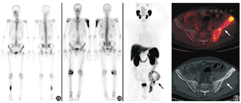 在高分化或中分化的转移性前列腺癌患者中,通常血清PSA>10 μg/L,但Gleason评分较高的低分化前列腺可几乎不产生PSA,因此PSA较低甚至正常并不能排除骨转移。另外,在接受了前列腺癌根治术、抗雄激素去势治疗、睾丸切除去势治疗的前列腺癌患者中,PSA会降到较低水平,在PSA<0.5 μg/L的患者中,68Ga-PSMA PET/CT仍有约1/3的阳性率,其中一半存在骨转移[5]。本例患者接受抗雄激素去势治疗后血清PSA降至0.5 μg/L,有多发骨转移的可能。