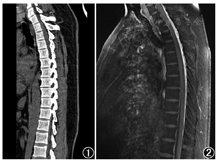 患者男,36岁,无明显诱因突发间断性头晕、头痛3个月余,表现为视物旋转,反复发作,多于活动时出现,每次持续数分钟,严重时伴恶心、呕吐,休息后可好转。否认高血压、冠状动脉粥样硬化性心脏病、糖尿病及外伤史。体格检查:四肢肌张力正常,双侧腱反射对称,未见明显感觉障碍。实验室检查(括号内为正常参考值范围):血常规WBC计数[18.59(3.50~9.50)×109/L]及中性粒细胞百分比稍增高[80%(50%~70%)];丙氨酸氨基转移酶升高[96.0(0.0~50.0) U/L]。颅脑MRI及弥散加权成像(diffusion weight imaging, DWI)未见明显异常。腰椎穿刺后测得脑脊液压力为0.58(0.78~1.76)kPa,脑脊液常规检查结果示细胞总数为1 003.0(0.0~8.0)×106/L,WBC计数为3.0(0.0~5.0)×106/L,蛋白质为0.9(0.2~0.4) g/L。结合病史及上述检查结果,倾向于诊断颅内感染。按照病毒性脑炎治疗后,患者仍间断头痛且剧烈,坐起时明显,最终临床考虑自发性低颅压综合征(spontaneous intracranial hypotension syndrome, SIHS)可能性大,对患者行CT及MRI查找脑脊液漏口。胸部CT(图1)示椎管内未见明显异常,胸、腰椎增强MRI(图2)示椎管内异常强化影,未见明确漏点,首先考虑SIHS。由于上述检查未能发现明确漏点,遂行核素脑池显像,检查前患者签署知情同意书。仪器为美国GE Discovery-670Pro SPECT/CT仪,显像剂99Tcm-二乙撑三胺五乙酸(diethylene triamine pentoacetic acid, DTPA)注射液由本科室自制(注射用亚锡喷替酸由北京师宏药物研制中心提供)。腰椎穿刺成功后,接上装有显像剂的注射器,取缓慢流出的脑脊液稀释至2.5 ml,再缓慢将110 MBq(0.8 ml)显像剂推注到蛛网膜下腔,然后放入针芯,拔针,盖敷料,患者去枕平卧休息30 min。于注入显像剂后0.5、1.5、2及3 h行局部(颈胸段)平面显像,3.5 h行局部SPECT/CT显像。0.5 h平面显像示从腰段至枕大池,脊髓蛛网膜下腔显影,放射性分布均匀,未见明显异常放射性分布浓聚影(图3A);1.5 h及2 h显像示上后纵隔、左侧椎旁见局灶性放射性浓聚影,似与椎管相连(图3B,图3C);3 h显像示上后纵隔、左侧椎旁放射性影像较前稍增浓(图3D);3.5 h SPECT/CT显像示胸2椎水平左侧附件区、椎管旁见局限性放射性浓聚影且与椎管影像相连(图4)。根据核素脑池显像影像表现,临床行手术探查,术中在显微镜下可见胸2神经根处蛛网膜撕裂并漏出清亮脑脊液,仔细分离出漏口,2次缝扎并用耳脑胶封闭漏口处。术后1个月及1年随访2次,患者已无头痛、头晕等症状,临床治愈。