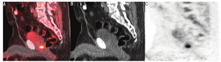18F-fluciclovine PET/CT图像解读时需要考虑18F-fluciclovine的生理性摄取和前列腺癌复发(前列腺切除床和盆腔深部淋巴结,以及腹股沟周围或远处髂外区域淋巴结)的典型摄取表现,尽管远处转移也可见(图5)。