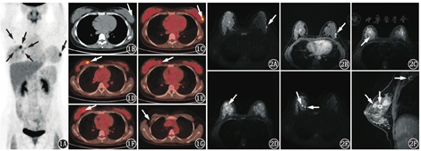 患者女,28岁,妊娠早期常规检查发现左乳包块,随访3个月左乳包块增大,行粗针穿刺活组织检查(简称活检),病理学确诊为左乳浸润性导管癌。基于乳腺癌确诊时患者处于妊娠中期,乳腺外科推荐了包含表柔比星和环磷酰胺的新辅助化疗方案。患者完成4个疗程化疗后分娩,1个月后至本科行18F-脱氧葡萄糖(fluorodeoxyglucose, FDG)PET/CT(德国Siemens Biograph 16)检查全面评价乳腺癌(患者签署知情同意书)。PET/CT显像示:左侧乳腺3点钟方向结节状FDG代谢增高灶,最大标准摄取值(maximum standardized uptake value, SUVmax)为5.3(图1A,图1B,图1C);右侧乳腺内上象限多个结节状FDG代谢增高灶,SUVmax为5.7(图1A,图1D,图1E,图1F);右侧腋窝见1枚增大淋巴结,FDG代谢轻度增高,SUVmax为1.2(图1G)。左侧乳腺FDG高代谢灶与以前确诊的乳腺癌位置一致,FDG高代谢提示新辅助化疗后仍有活性癌细胞存在。右侧乳腺和右侧腋窝的FDG高代谢灶是否与乳腺癌有关尚不能确定。患者后行MRI:左侧乳腺癌病灶T1加权像呈稍低信号,T2加权像呈稍高信号,弥散加权像呈高信号(图2A),对比增强T1加权像呈明显强化(图2B);右侧乳腺的多个病灶T1加权像呈等信号,T2加权像主要呈高信号,但病灶周围见低信号环包绕,似"戒指"状(图2C,图2D),弥散加权像呈明显高信号(图2E),提示弥散明显受限,对比增强T1加权像呈明显环形强化(图2F),右侧腋窝增大的淋巴结也呈中等程度强化(图2F)。于患者右侧乳腺FDG代谢最高病灶行粗针穿刺活检,病理结果示积乳囊肿。