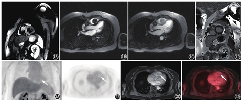 心脏肿瘤少见,可分为原发性和继发性2种,后者的发病率是前者的20~40倍[1]。MR在心脏肿瘤的诊断中发挥了重要作用[1,2,3]。MR可准确、全面、清楚地显示心脏肿瘤的部位、大小、形态、与周围结构的关系等,且特定的组织信号特征定性诊断脂肪瘤及纤维瘤的准确性非常高,但该方法对于大多数心脏肿瘤的良恶性鉴别主要根据病变的生长方式、血供特点等,缺乏特异性[2]。18F-FDG PET反映病变的糖代谢,有助于心脏肿瘤的良恶性鉴别。一体化PET/MR融合了PET与MR技术,能提供一站式解剖结构及代谢信息,对于心脏肿瘤的良恶性鉴别及治疗方案的制定具有重要意义[4]。本例为甲状腺异位于右心室患者,18F-FDG PET/MR在其诊断中发挥了重要作用。MR清晰显示病变位于右心室,高灌注提示富血供病变,并有延迟强化,提示其为肿瘤性病变而非血栓;病变局限于右心室,形态较规则,体积较小,未呈浸润性生长,且核磁信号相对均匀,提示为良性病变。而18F-FDG PET显示病变轻微代谢,最大标准摄取值(maximam standardized uptake value, SUVmax)为1.5,与血池及心室壁心肌相仿(心肌SUVmax为1.6),进一步验证了其为良性肿瘤性病变。