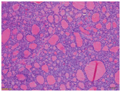 心脏的良性肿瘤以黏液瘤最多见(但黏液瘤常发生于心房,心室极为少见),其次为纤维瘤、血管瘤和脂肪瘤等。纤维瘤好发于儿童及青少年,可在心肌内及腔内生长。由于富含成纤维细胞及胶原纤维,瘤体常信号均匀,T1W呈等或低信号,T2W呈低或无信号,这与其他心脏肿瘤相比具有特征性,与本例表现不符。脂肪瘤在T1W和T2W均为高信号,压脂后信号明显,CT为脂肪低密度,与本例表现不符,可以排除。血管瘤在T2W多为高信号,动脉早期多为周边结节样强化,延迟呈渐近性强化,与本例T2W呈稍高信号、早期异常高灌注且强化较均匀不符。本例18F-FDG PET/MR报告结果中仅给出心脏良性肿瘤的诊断意见,未给出具体的病理类型,也是考虑了上述原因。后经手术病理证实此例为右心室异位甲状腺。首次病理诊断根据形态学及免疫组织化学首先考虑为滤泡性甲状腺癌转移,但并不能除外异位甲状腺,这是因为转移区域的滤泡性甲状腺癌较原发部位呈现好的组织分化,与异位甲状腺组织很难鉴别,此时需要结合形态学、影像学及临床进行综合分析[5]。本例患者甲状腺超声未见明确肿瘤病灶,经综合考虑右心室内病变为异位甲状腺组织。