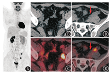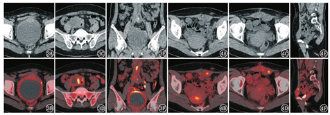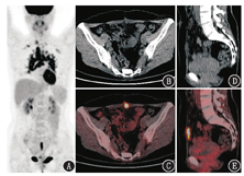移位的卵巢生理性摄取需要与病理性情况相鉴别,同样地,异位的子宫内膜的生理性摄取也需要与恶性病变相鉴别。处在月经期的异位子宫内膜可以和月经期宫内的内膜一样,有生理性摄取增高(图2)。子宫内膜组织异位于卵巢可形成卵巢巧克力囊肿,也可广泛异位于腹盆腔,并且反复出血、形成纤维素性包裹,造成粘连、囊肿破裂,还可继发盆腔炎或盆腔囊肿,这种伴有活动性炎性反应的子宫内膜异位症也可表现为FDG代谢增高(图3)[7]。但需要注意的是,异位的子宫内膜有一定的恶变概率(约2.5%)[8],如恶变为卵巢透明细胞癌、子宫内膜样癌、低级别浆液性癌等,在PET/CT上难以鉴别(图4),需要进一步病理检查。