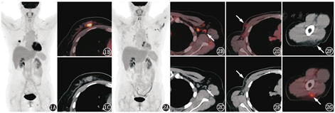 引起淋巴结FDG代谢增高的良性疾病多见于感染[如结核、Epstein-Barr病毒(Epstein-Barr virus, EBV)感染]、自身免疫性疾病[如免疫球蛋白(immunoglobulin, IgG)4相关疾病、结节病]、反应性增生等。根据该例患者的病史和PET/CT表现,并未见以上病因的蛛丝马迹。再仔细观察PET/CT图像,发现左上臂三角肌部位的皮下脂肪内见片絮状的代谢稍高影(图2F、2G,箭头示)。该类表现在阅片时易被忽略,或直接判断为肌肉局灶性的生理性摄取或皮下和(或)皮肤组织非特异性炎性病变,大多没有临床意义。然而对于本例而言,该处病变距离腋窝近,且为同侧,如果此处是明确的炎性病灶,则可以解释左侧腋窝出现代谢增高淋巴结的原因。