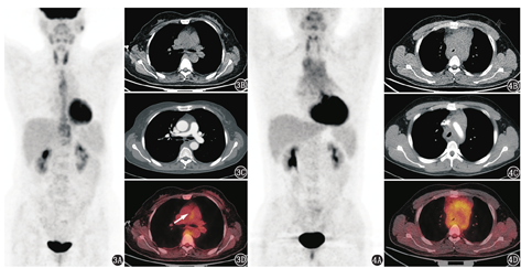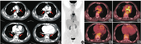 纵隔纤维化在病理上可分为3期[2],Ⅰ期见水肿样的纤维黏液组织含有众多的梭形细胞、嗜酸性粒细胞、肥大细胞、淋巴细胞、浆细胞和薄壁血管;Ⅱ期可显示杂乱排列的胶原伴有局灶性间质性梭形细胞、淋巴细胞和浆细胞;Ⅲ期为致密的无细胞胶原蛋白,伴散在的淋巴滤泡,偶见营养不良性钙化。根据病理上不同的阶段,炎性细胞活跃程度不同,纵隔纤维化病灶内FDG代谢程度差异较大。当处于炎性反应活动期时,病灶内浸润较多的炎性反应细胞,葡萄糖利用增多,导致FDG代谢增高;而处于炎性反应非活动期时,病灶内纤维组织增加,代谢程度较低;由于病灶内可以同时出现处于不同炎性反应时期的病变,所以PET可表现为均匀或不均匀摄取增高或不高的表现。本例患者FDG代谢最高区域为双侧肺动脉主干,也是阻塞最严重的部位,这可能与该部位处于病变活动期有关。
