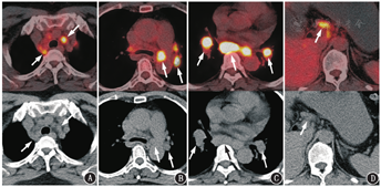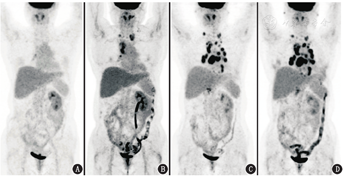 患者女,55岁,右输尿管癌术1年余,多疗程放化疗后,发现多发淋巴结肿大3个月。患者于2019年5月因右侧输尿管可疑恶性占位行"腹腔镜右侧半尿路切除术"(右肾+右输尿管全长+右输尿管开口周围部分膀胱切除),术后病理提示:肾盂输尿管高级别浸润性尿路上皮癌,侵及输尿管肌层,淋巴结转移癌(肾门1/1),手术病理分期pT2N1Mx(Ⅳ期)。术后1个月行18F-脱氧葡萄糖(fluorodeoxyglucose, FDG)PET/CT显像,未见肿瘤残留或转移(图1A)。后行3个疗程辅助化疗(吉西他滨+顺铂)及多次放疗(放疗野包括右侧肾窝及输尿管走行区、膀胱三角区、下腔静脉及右腹主动脉旁淋巴引流区),至2019年12月结束。2020年10月,患者自行触及双侧锁骨上区包块,2021年1月复查18F-FDG PET/CT新见双侧锁骨上/下、右肺门及纵隔多发代谢增高淋巴结,最大者位于纵隔4R区,大小约2.2 cm×1.7 cm,最大标准摄取值(maximum standardized uptake value, SUVmax)为7.4;腹盆部未见明显异常(图1B)。输尿管淋巴引流丰富,输尿管尿路上皮癌病程早期即易发生淋巴转移,通常先转移至区域淋巴结,与原发灶所在输尿管节段相关,而晚期疾病可转移至任意组淋巴结[1],加上腹盆腔淋巴引流区都经过了放疗,所以此次有可能直接出现颈胸部淋巴结的跳跃性转移。患者自2021年1月起,予度伐利尤单克隆抗体(简称单抗),其为程序性细胞死亡蛋白配体1(programmed death-ligand 1, PD-L1)阻断剂,属于免疫检查点抑制剂(immune checkpoint inhibitors, ICIs)治疗。4个疗程抗PD-L1治疗后于2021年4月复查18F-FDG PET/CT,相较于治疗前,新见纵隔、双肺门及上腹部多发代谢增高的肿大淋巴结(图1C)。患者之后继续接受6个疗程抗PD-L1治疗,2021年6月复查18F-FDG PET/CT,可见原颈胸部淋巴结数量、大小、代谢活性大多变化不明显(图1D)。