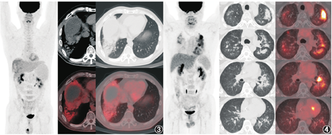 影像学上免疫相关肺炎主要表现为不同类型的间质性肺疾病,大致可分为机化性肺炎、非特异性间质性肺炎、过敏性肺炎、弥漫性肺泡损伤几大类[10]。但免疫相关肺炎需要与肺部感染鉴别,二者在肿瘤患者治疗期间都比较容易出现,影像表现有相似,而治疗方向却相反(糖皮质激素与抗生素等)。如图4是1例纵隔大B细胞淋巴瘤患者,曾接受化疗、自体干细胞移植、嵌合抗原受体T细胞回输、抗PD-1治疗,患者抗PD-1治疗8个月后出现了胸闷、气短、血氧饱和度下降,18F-FDG PET/CT示双肺多发磨玻璃、斑片及实变影,以中上肺、中央带分布为著,实变者内见支气管充气影,病灶代谢不同程度增高,SUVmax为9.7,最终临床诊断肺孢子菌肺炎,混合巨细胞病毒感染,予复方磺胺甲恶唑、更昔洛韦、泼尼松治疗后,患者症状缓解、肺部阴影消失。