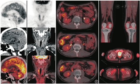 18F-FDG PET/CT上常见到的irAEs还有免疫相关性垂体炎(图5A)、甲状腺炎(图5B)、结肠炎(图5C)、关节炎(图5D)等。需要注意的是irAEs容易出现在治疗后2~3个月,但有时也可以延迟至近2年后出现,且停止治疗后仍可进展[11]。