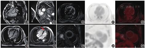 该患者18F-脱氧葡萄糖(FDG)PET/MR显像图。2A,2B. T2加权序列抑脂相[长轴四腔心(2A)、短轴两腔心(2B)],可见右心室壁明显变薄(右心室壁部分脂肪信号被抑制所致),部分信号中断,呈"岛"状,右心室前壁原脂肪信号区为无信号区,右心室腔内见高信号慢血流;2C,2D. PET图像提示未见异常放射性浓聚;2E,2F.融合图像示心肌内无异常18F-FDG摄取