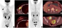 PET/CT上转移灶明确且代谢高,而原发灶"隐匿"的情况并不十分罕见,主要原因是原发灶比较小,阅片时可能被忽略;或原发灶位于周围本底摄取较高的区域,被"掩盖"了;再或者原发灶和转移灶的分化或某些病理特征不同,代谢程度有较大差异。这时,一要仔细观察有较高本底摄取的脏器或部位并采集相关病史,来除外此处肿瘤发生转移(如泌尿系统[1]、肠道、肝脏、口咽部等);二要根据转移模式和病理类型推定可能的原发灶,如出现锁骨上淋巴结转移或腋窝淋巴结转移或骨转移的腺癌需要进一步筛查前列腺癌及乳腺癌,有腹膜转移或腹腔积液的腺癌需要警惕泌尿生殖系统、胰腺及胆道系统原发肿瘤,有肝脏转移的腺癌需进一步检查消化道系统、胰腺及胆道系统、乳腺来源的肿瘤,全身多发转移的腺癌需重点考虑前列腺癌及乳腺癌,头颈部淋巴结或锁骨上淋巴结转移的鳞状细胞癌(简称鳞癌)需重点关注头颈部肿瘤,纵隔淋巴结转移的鳞癌需重点筛查非小细胞肺癌等。如图2为1例右侧腋窝淋巴结转移患者,临床高度怀疑乳腺癌转移,而PET/CT上乳腺未见异常代谢,CT也未见明确占位;随后乳腺超声见右乳内下象限乳腺影像报告和数据系统(breast imaging reporting and data system, BI-RADS) 4b级病变,患者遂行右乳肿物扩大切除术及右腋窝淋巴结清扫术,术后病理提示右乳低分化浸润性癌,伴右腋窝淋巴结转移。图3为1例胃癌伴双侧卵巢转移患者,PET/CT见双侧卵巢转移灶代谢明显增高,而胃壁代谢未见明显异常(胃镜见胃体大弯侧溃疡)。