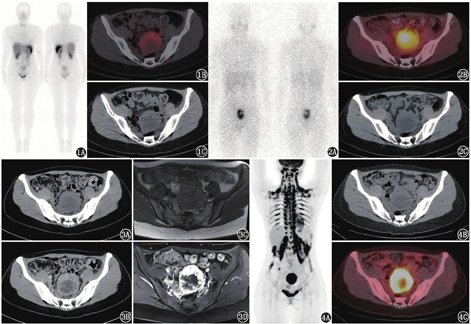 本例定性诊断已明确——PPGL所致的继发性高血压,所以盆腔占位考虑PPGL可能性大。值得注意的是,部分非PPGL(或非神经内分泌肿瘤)也可能在SSTR显像或肾上腺髓质显像中表现为阳性,如胃肠道间质瘤、肾上腺皮质腺瘤、副脾、淋巴瘤、肝血管瘤、血管平滑肌脂肪瘤等在肾上腺髓质显像中可能表现为阳性,而乳腺癌、肾癌、肺癌、淋巴瘤、正常子宫或者子宫肌瘤等可在SSTR显像中出现高摄取[4]。为进一步明确病变诊断及其与周围组织、血管的关系,本例患者行增强CT和MRI,结果显示盆腔肿物明显不均匀强化(图3),符合PPGL的影像特点。