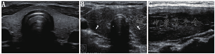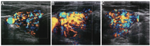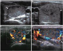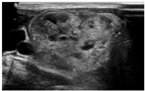 TMNG的甲状腺常比弥漫性甲状腺肿的甲状腺大,通常回声不均匀且合并大小不等及回声不均的结节(图3)。这些结节部分具有功能,部分是无功能的。超声引导下细针穿刺活组织检查(简称活检)一般只考虑穿刺无功能结节,因为甲状腺显像表现为热结节者为肿瘤的概率极低[24]。TAs超声通常表现为实性、等或低回声且边界清楚的结节,结节边缘或结节内、结节周围血供丰富(图4)。