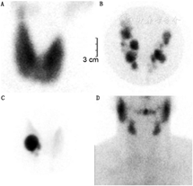 亚急性甲状腺炎甲亢期、破坏性甲状腺炎和人为甲状腺毒症的甲状腺显像通常表现为显像剂摄取降低或缺乏(图5D)。在AIT中,有2种病理生理机制导致甲状腺显像不摄取或低摄取。131I或99TcmO4-甲状腺显像不能将1型AIT(胺碘酮治疗引起的高碘负荷减少了非TMNG背景下碘转运和有机化)与2型AIT(胺碘酮导致的甲状腺炎释放过多的甲状腺激素)区分开来。99Tcm-甲氧基异丁基异腈(methoxyisobutylisonitrile, MIBI)显像可以鉴别1型和2型AIT, 1型AIT表现为MIBI摄取,而2型AIT表现为MIBI摄取减低或缺乏[25]。