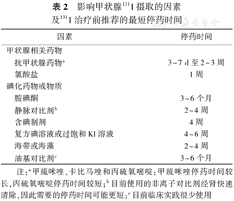 注:a甲巯咪唑、卡比马唑和丙硫氧嘧啶:甲巯咪唑停药时间较长,丙硫氧嘧啶停药时间较短;b目前使用的非离子对比剂经肾快速清除,因此需要的停药时间可能更短;c目前临床实践很少使用