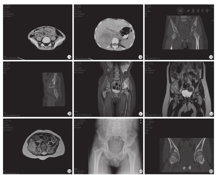 儿童髂骨破坏临床症状缺乏特征性,从本组22例临床症状来看,主要表现是髋部疼痛,疼痛呈间隙性,运动后加剧,休息后缓解;年龄主要集中在2~5岁,约占全部病例的63.6%。其次是下肢跛行,休息后多数不能缓解。另有4例髋部疼痛伴低热。因此对于学龄前儿童出现不明原因的髋部疼痛或下肢跛行,应及时拍摄骨盆的DR,范围包括双侧髋关节、双侧髂骨。对于X线片显示髂骨骨质溶骨性破坏,应注意观察骨破坏的形态是否规整,轮廓是否清晰,有无突入软组织的阴影,有无骨膜反应。CT和MRI检查是必要的,可以明确区分溶骨性破坏的良恶性。MRI对髂骨骨质破坏伴有软组织肿块的显示更为清楚,是早期显示骨髓破坏最敏感的方法。辅助检查对诊断的意义不大,但恶性骨破坏多有贫血,血沉轻度增高。