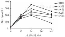 与正常对照组相比,各手术组术后血肌酐明显上升,在术后24 h血肌酐达到峰值,随后缓慢下降(P<0.05)。输注组(NS组、FV组、RA组、OV组)术后血肌酐上升较IRI组缓慢,术后24 h峰值明显低于IRI组,且恢复较快(P<0.05)。与RA组相比较,FV、OV组术后血肌酐降低,术后24 h峰值降低明显(P<0.01);术后48 h除OV组外,FV组和RA组血肌酐的差异无统计学意义(P>0.05)。FV组和OV组相比较,术后24 h血肌酐的差异无统计学意义(P>0.05),但术后48 h OV组血肌酐改善明显(P<0.05,表1,图1)。