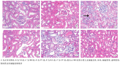 A为正常对照组,B为NS组,C为IRI组,D为FV组,E为RA组,F为OV组;箭头示IRI组肾小管上皮细胞变性、坏死,细胞管型、透明管型,肾间质炎性细胞浸润增多